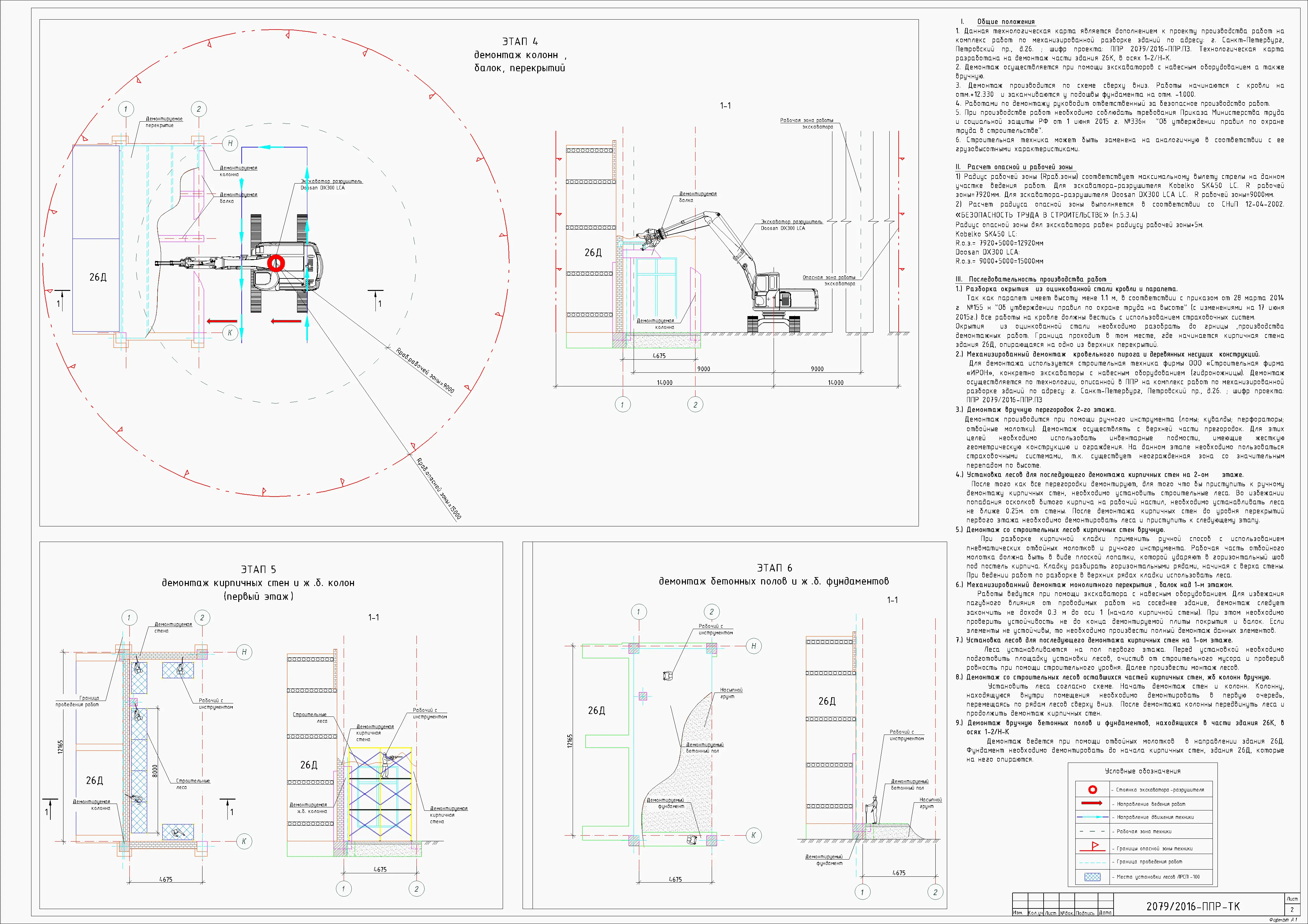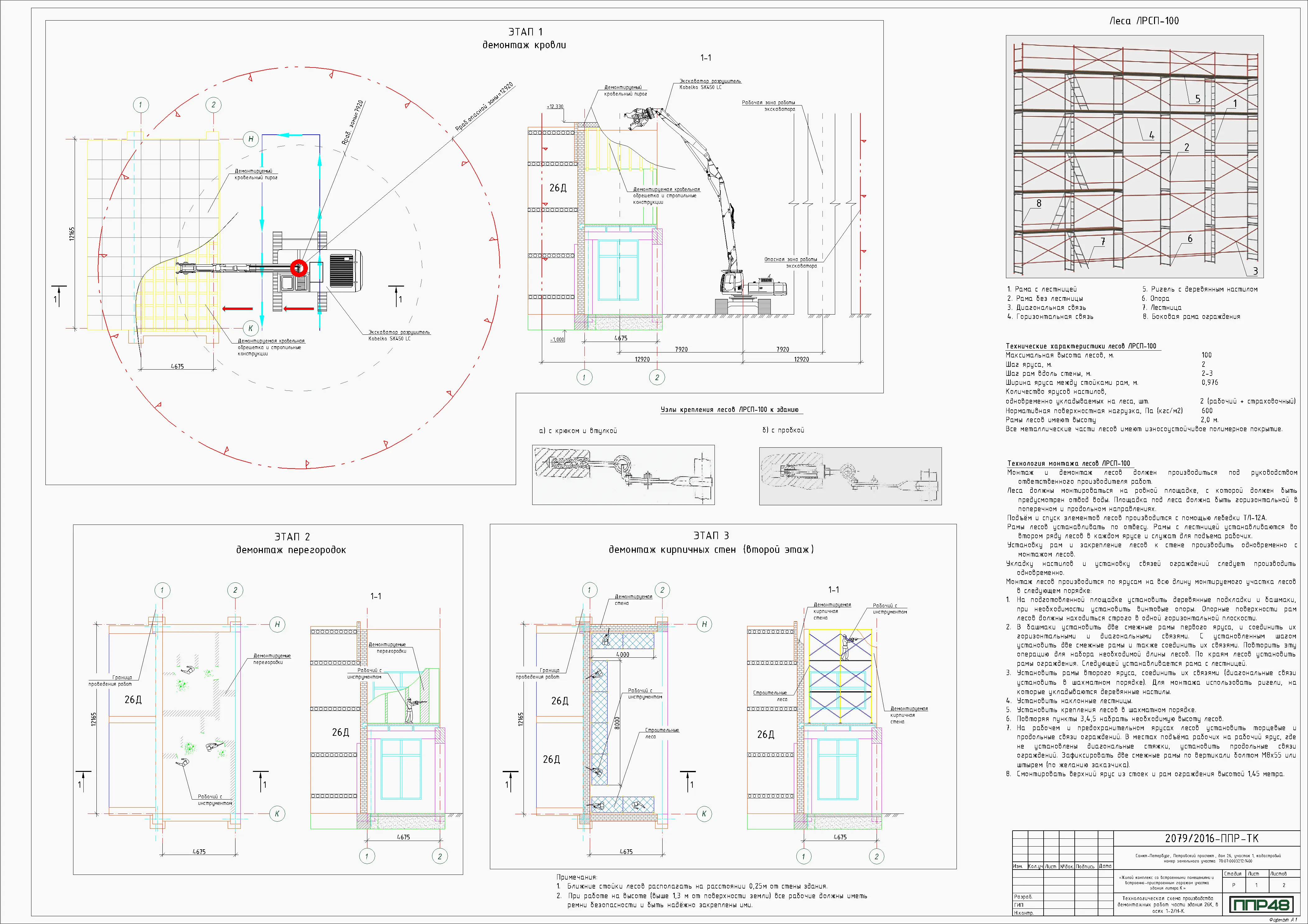Проект производства работ на демонтаж объекта и его сноса разрабатывается на основе проекта по сносу (ПОД) и прочих исходных материалов . Количество разрабатываемых ППР должно соответствовать кол-ву заданий, обозначенных в ПОД. В процессе разработки ППР при демонтажных работах рекомендуется учитывать положения из СТО НОСТРОЙ 2.33.53-2011. Важной целью проекта является обеспечение безопасности при выполнении демонтажных работ. Поэтому в его состав включают раздел по охране труда при демонтаже и сносе конструкций. Данный раздел должен учитывать опасные ситуации, возникающие вследствие обрушения демонтируемых конструкций при сносе, предусматривать меры по их устранению. Для того, чтобы сохранить зеленые насаждения, находящиеся в зоне осуществления технологических операций при сносе, в документ следует включить раздел по охране окружающей среды.