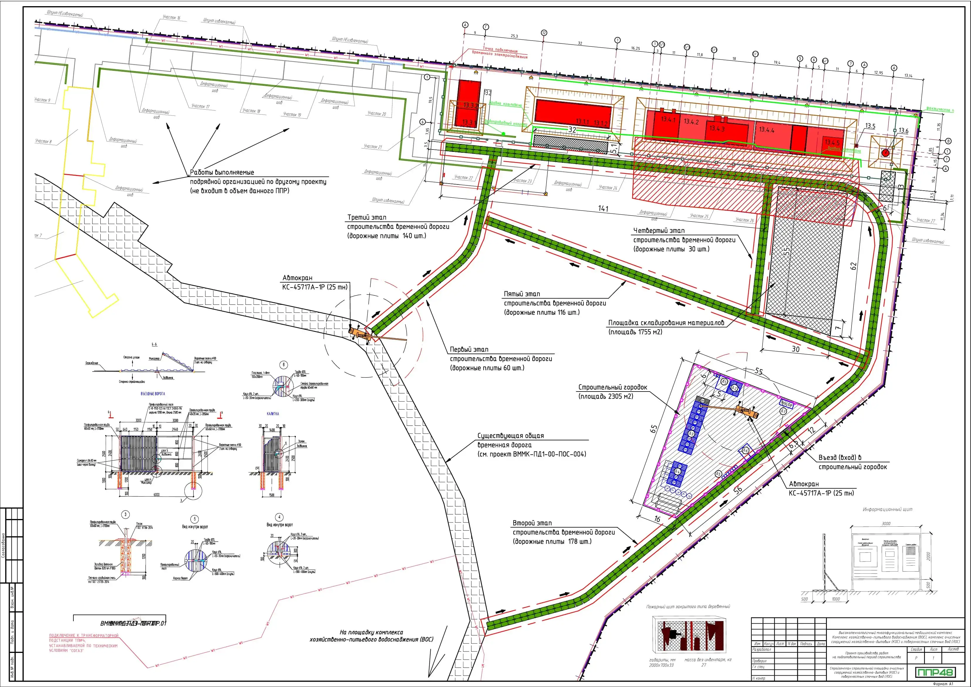 В разработке ППР на устройство строительного городка всегда необходимо учитывать последовательность выполнения работ. Зачастую мы начинаем свою работу с оформления подробного строительного генерального плана, на котором мы указываем размещение временных зданий и сооружений, бытовки, зоны стоянок строительной техники. Также мы отрисовываем в полном соответствии с ГОСТ 21.508-2020 внутриплощадочные дороги, показываем сети временного электроснабжения и электроосвещения.